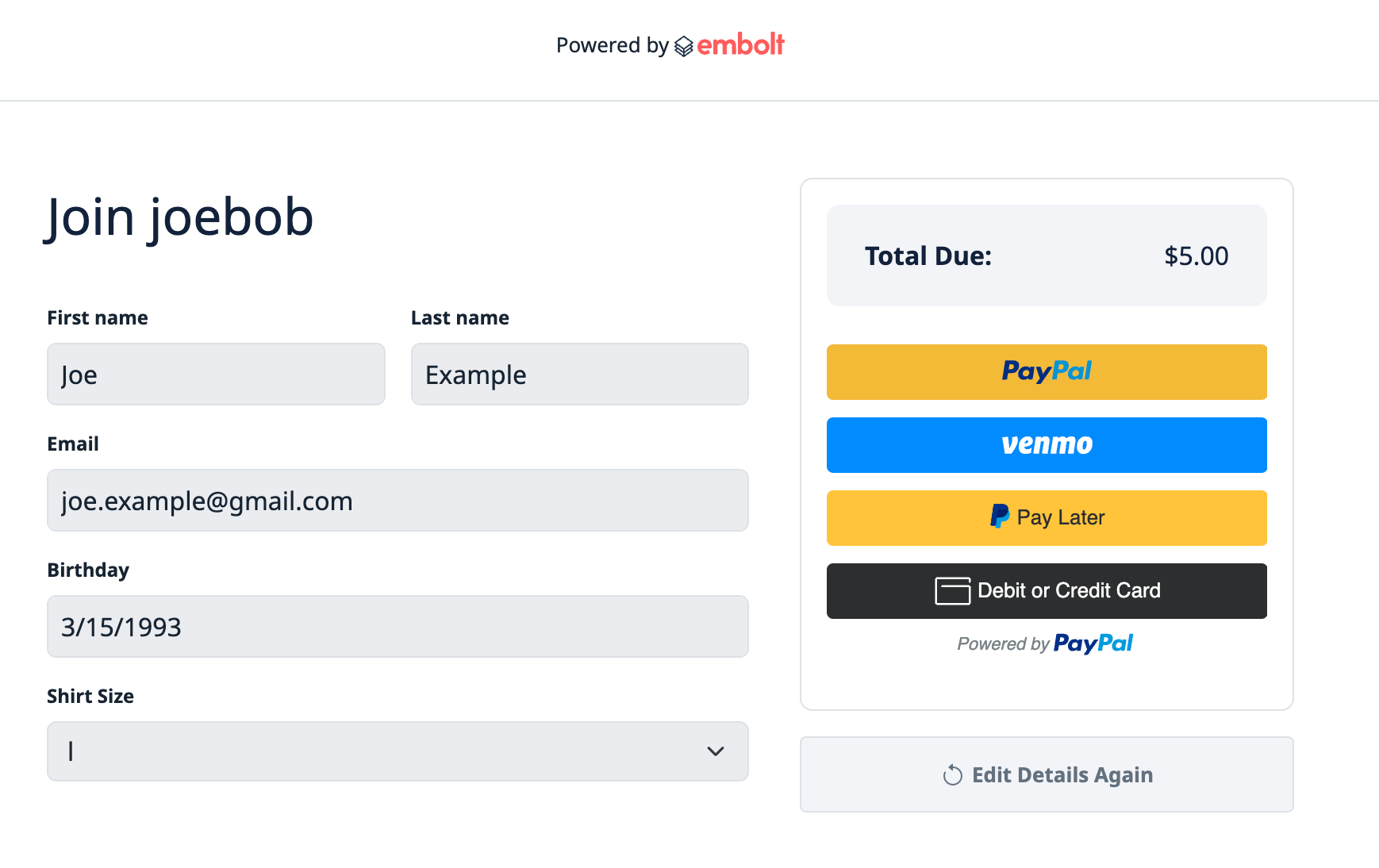 Simplifying the payment process is essential for any club, and embolt.app makes it easy with its direct payment integration with PayPal. This integration allows members to pay their dues using Credit Card, Venmo, or PayPal, providing them with convenience and security.