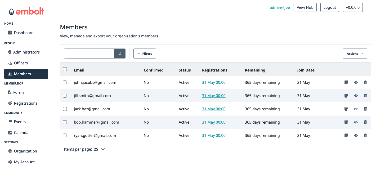 embolt.app manages all of your data for you on top of payment history and transactions of your members. This way when next year comes around embolt’s member database can automatically calculate the membership status of your members as well as a host of other useful information and analytics: