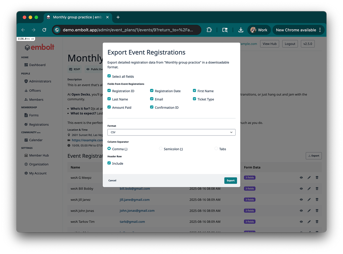 Q: What information can I export? A: You can export registration IDs, dates, attendee names, emails, ticket information, payment details, and any custom form field responses.