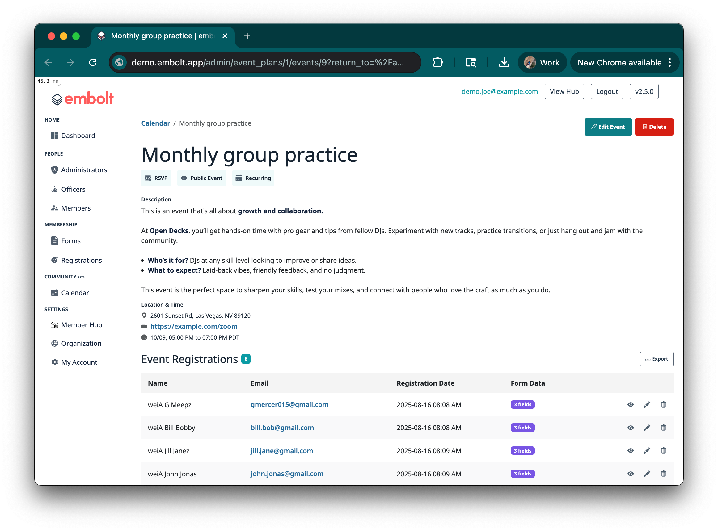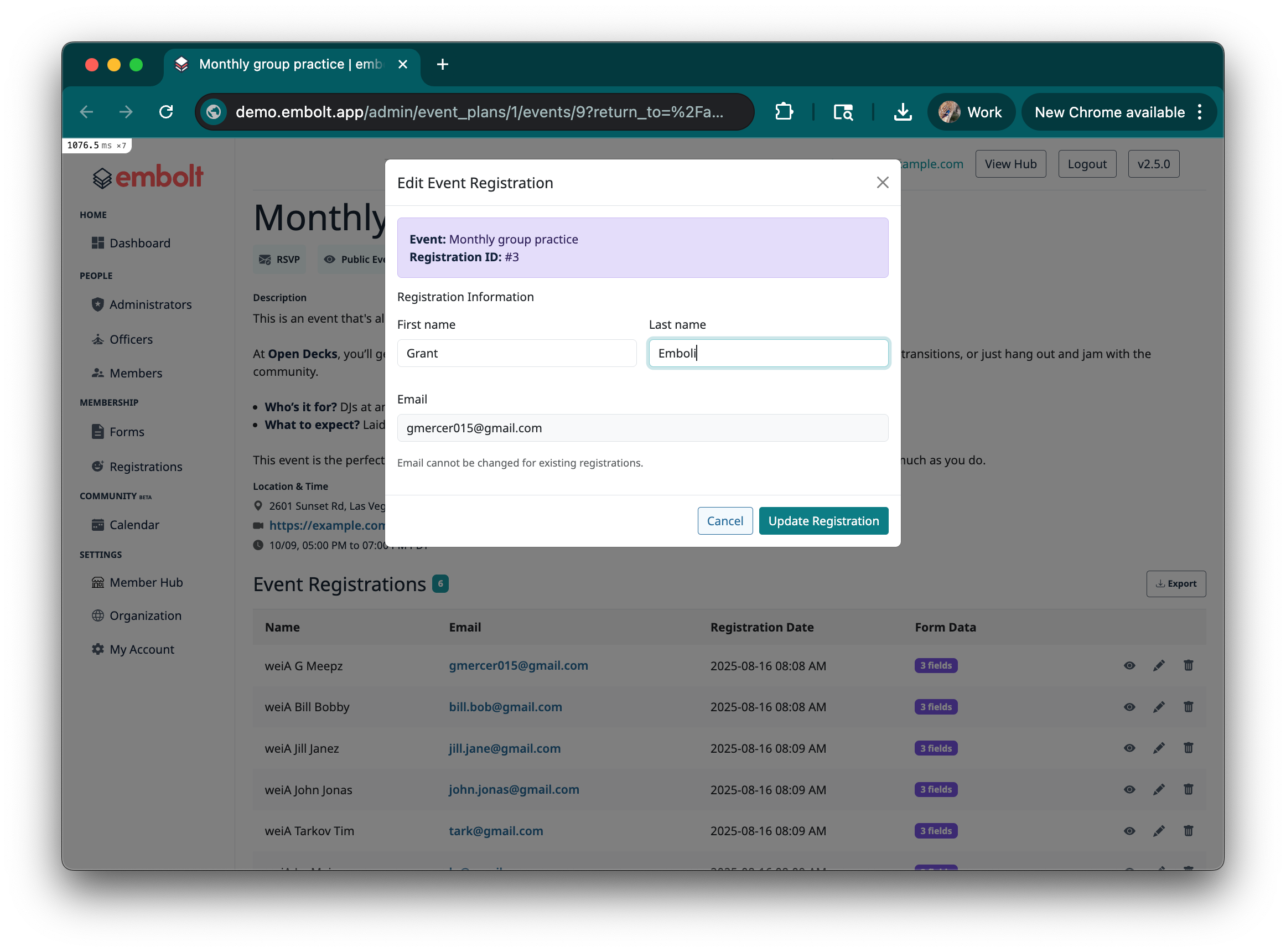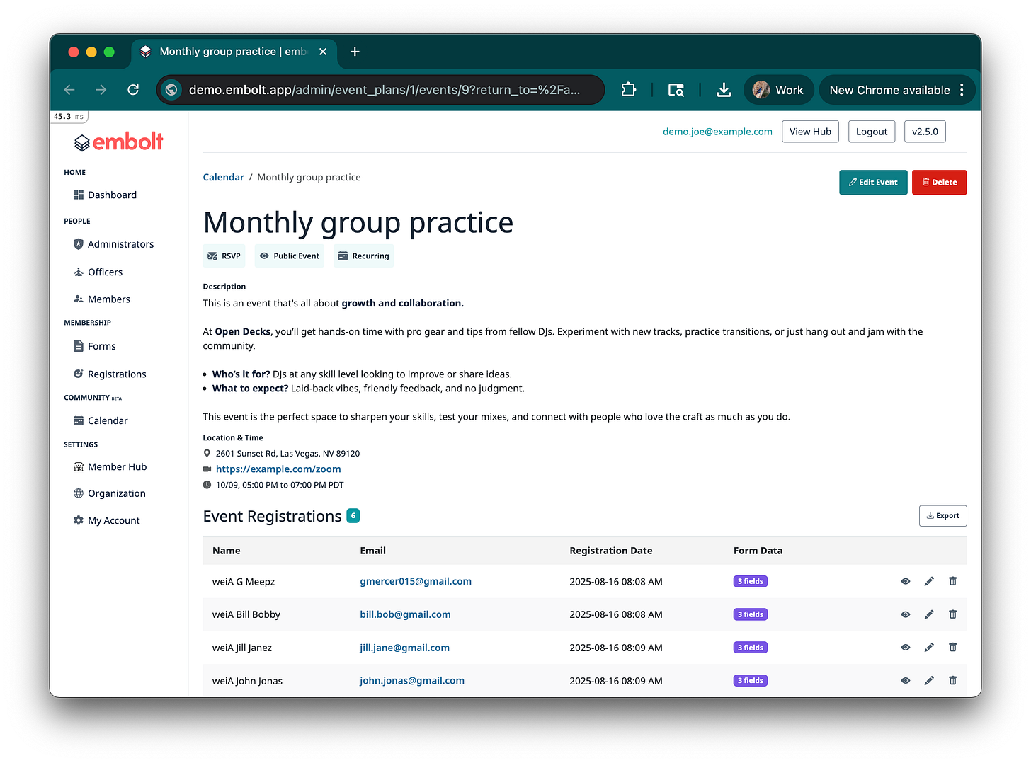 We've added comprehensive registration management tools to help you better oversee event attendees and their data. Head over to your organization now or book a call with us to learn more about hosting your organization on embolt.app