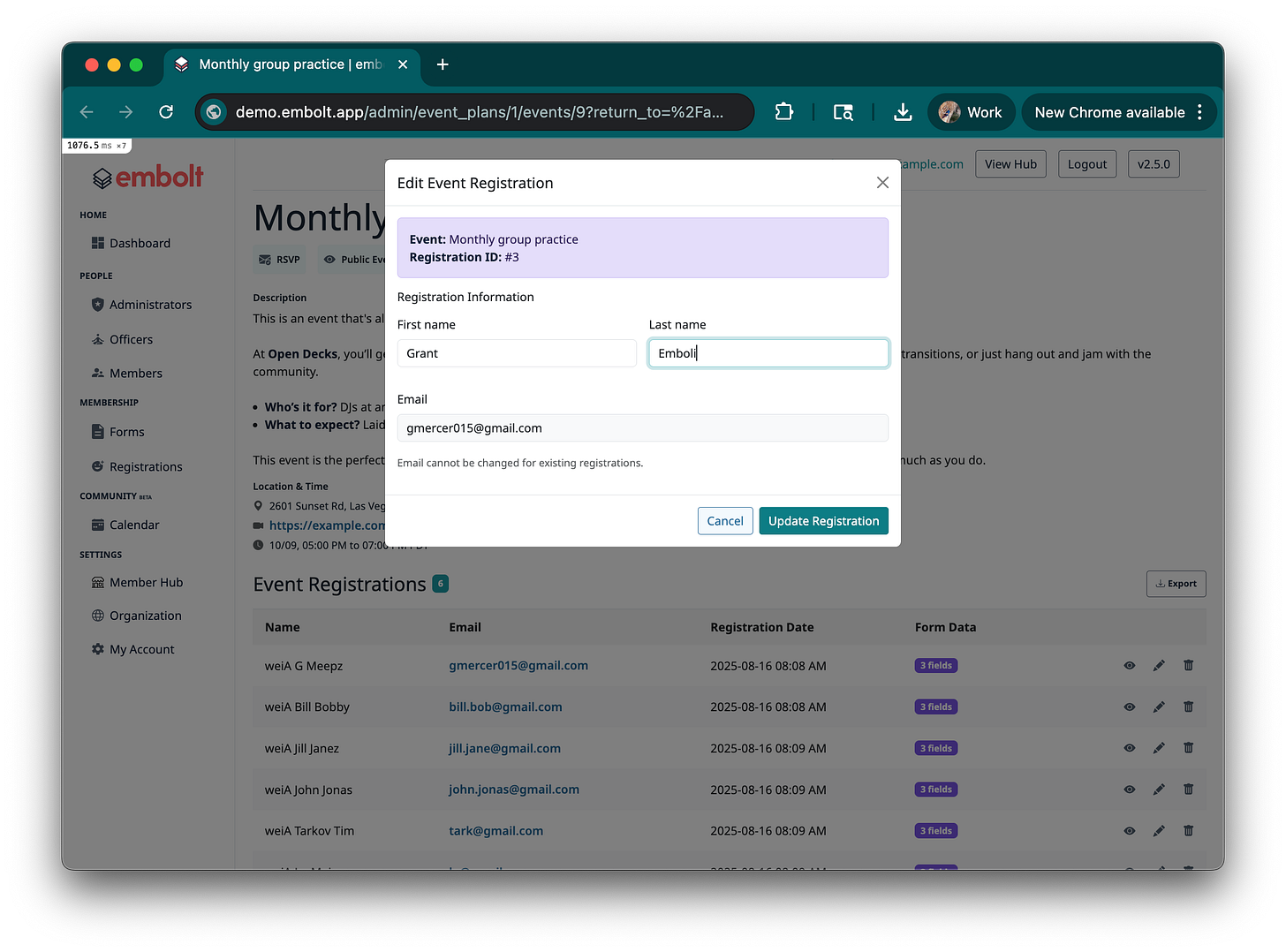 You can now edit individual event registrations directly from the event page. Update attendee information, modify ticket selections, and adjust payment details as needed. Email addresses are protected and cannot be changed to maintain data integrity.