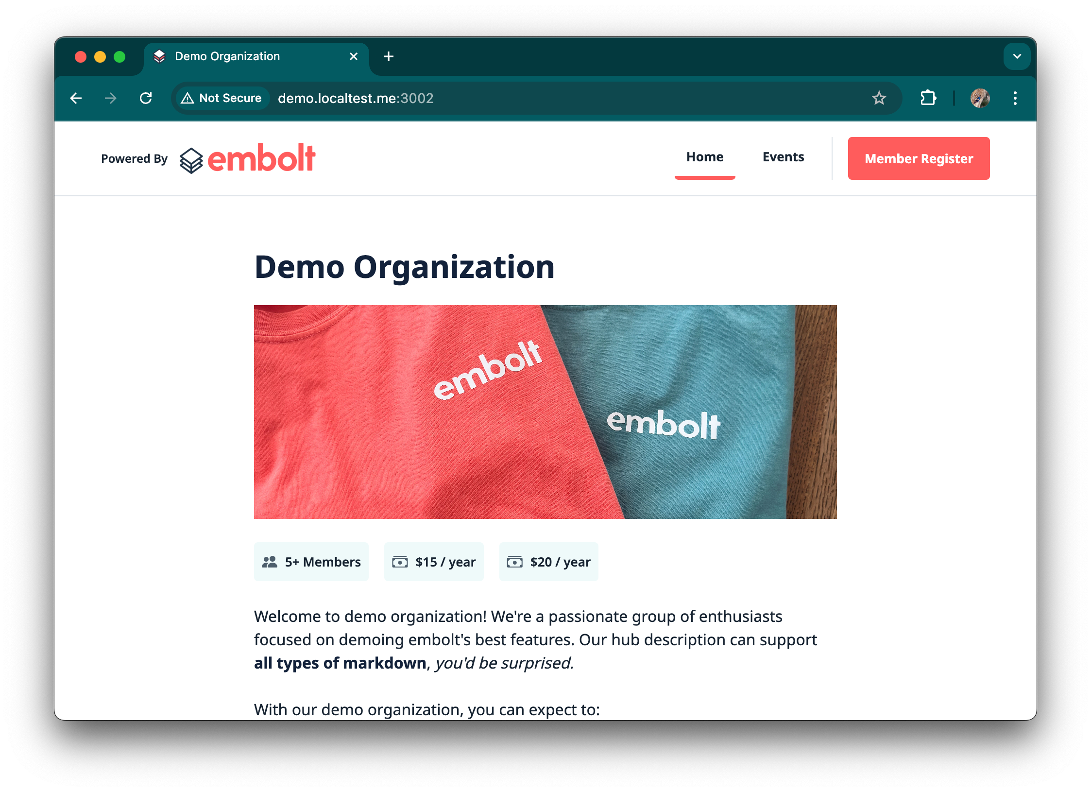 All clubs on embolt are automatically provided a membership hub located at the root URL of their custom hosted subdomain. Using the example above, if you select your slug / hostname as “lvrc” your hub will immediately be available at lvrc.embolt.app