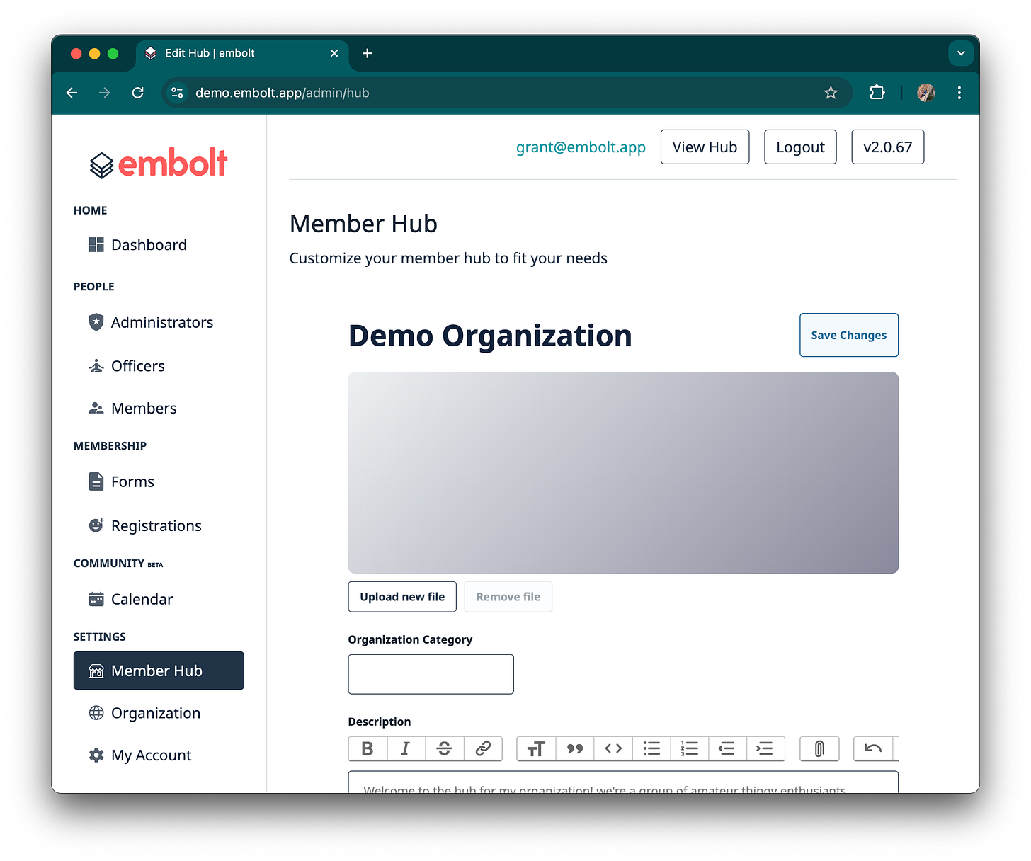 We use the term membership hub to describe the place on embolt where your club’s members will interact with you. This is different from the administration panel where you and your board can manage your members, events, and so on.