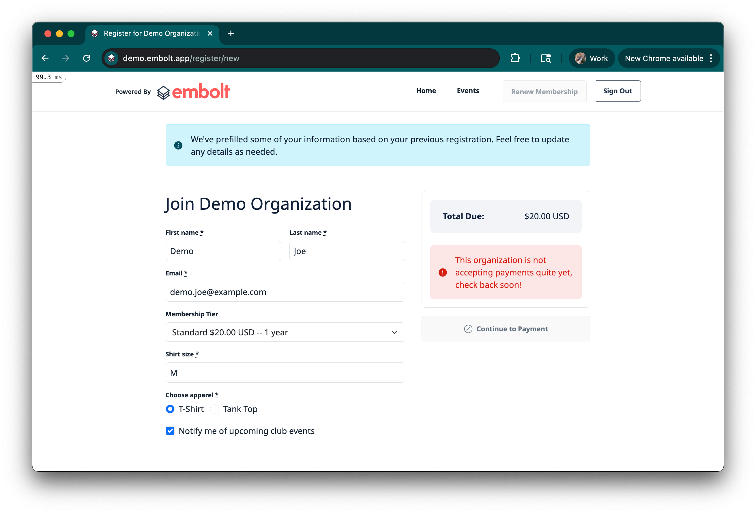 Today we're launching an easy way for your members to renew with their existing information on your embolt organization.