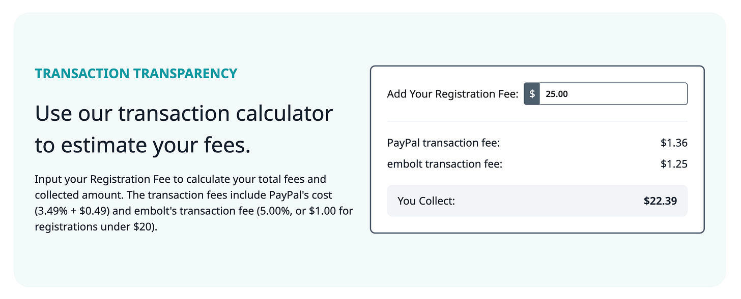 If you decide to start accepting members through embolt and charging members dues, embolt does ask for a 5% surcharge on top of the transaction paid by the member. You can use our online calculator to estimate how much you’d receive per transaction before making any decisions.