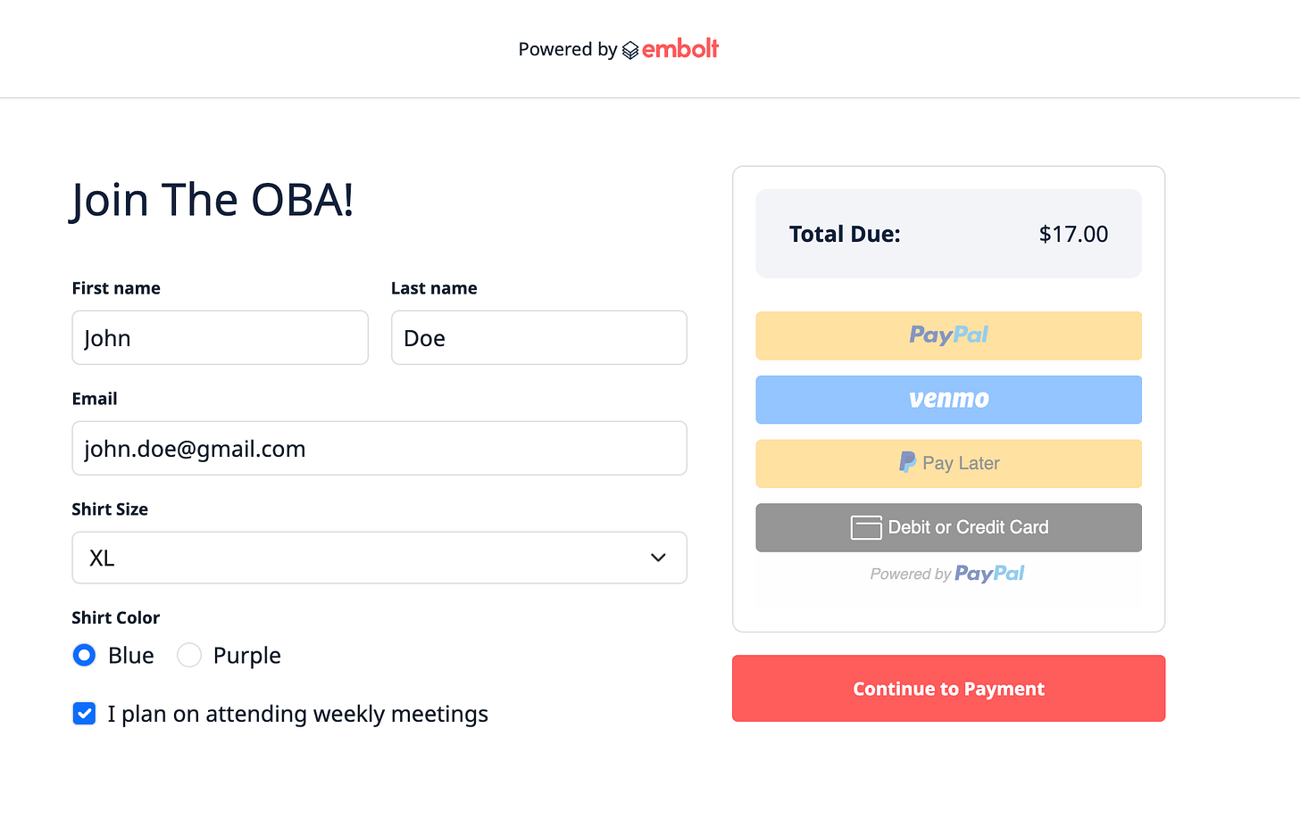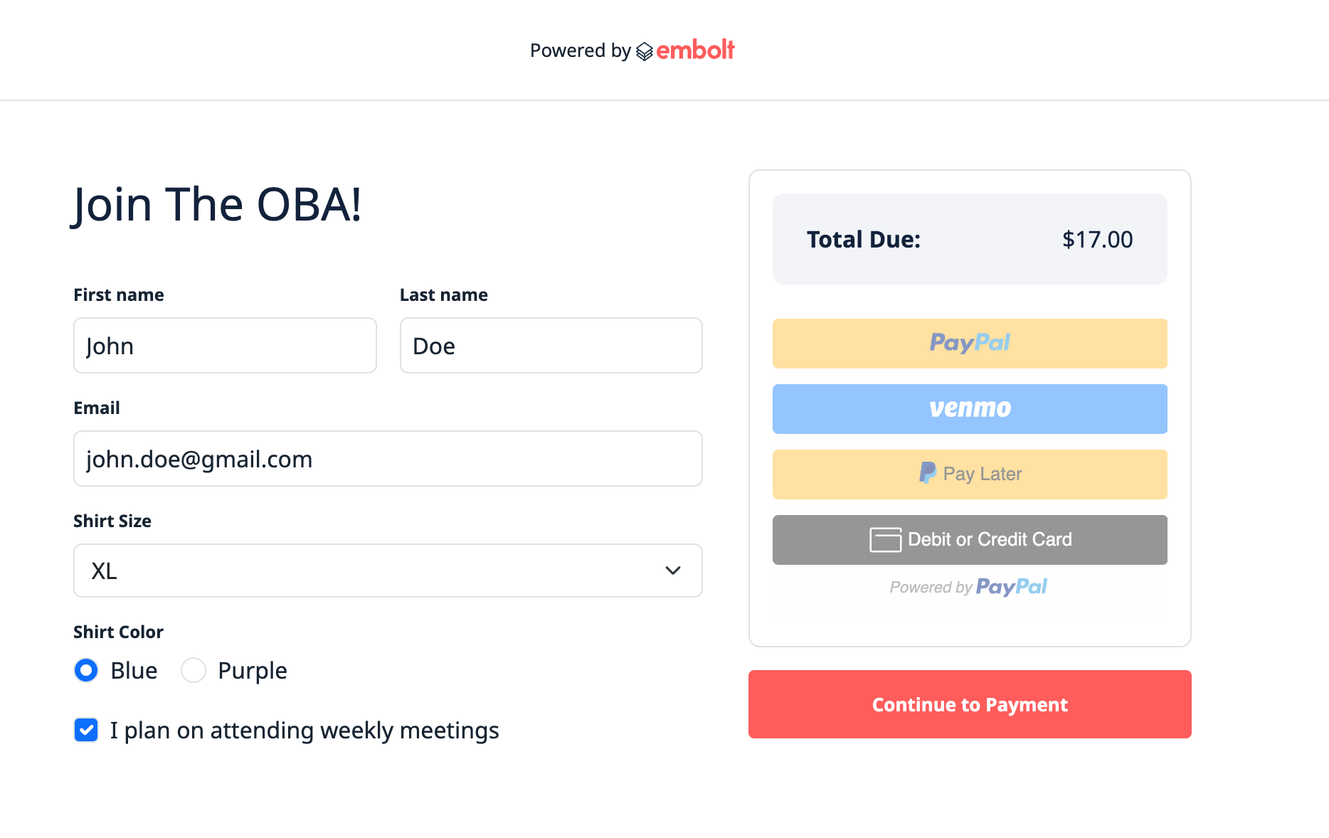 For example, if your organization is “Organization of Bishops Anonymous”, you might have this registration form hosted on oba.embolt.app which your members can easily access and signup at.