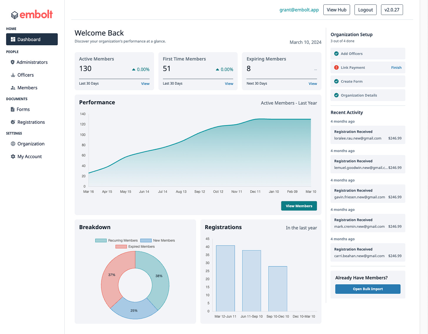 embolt offers a powerful analytics dashboard for clubs to get a bird’s eye view on their past and future performance. Not all clubs need to be financially motivated, but being able to identify trends and how initiates pay off is an important part of any club.