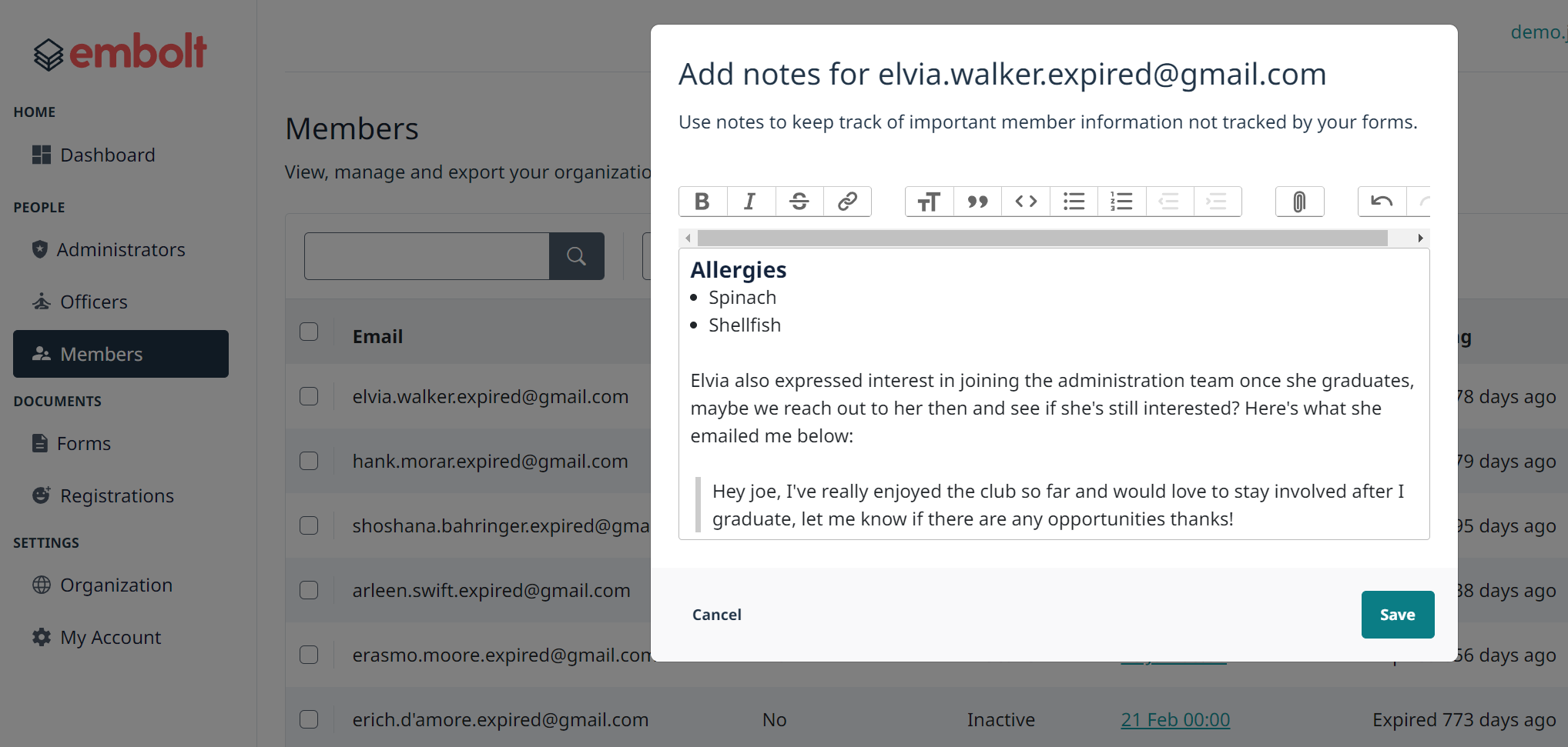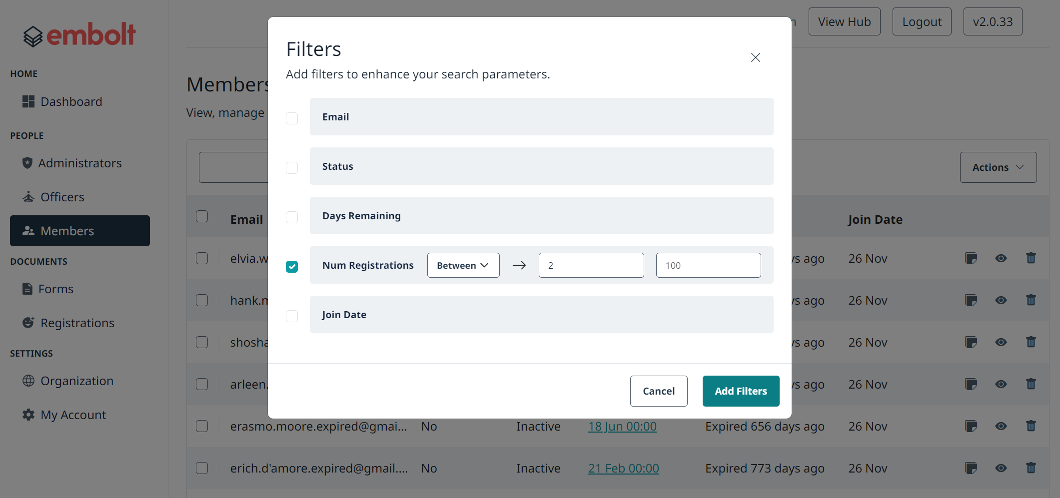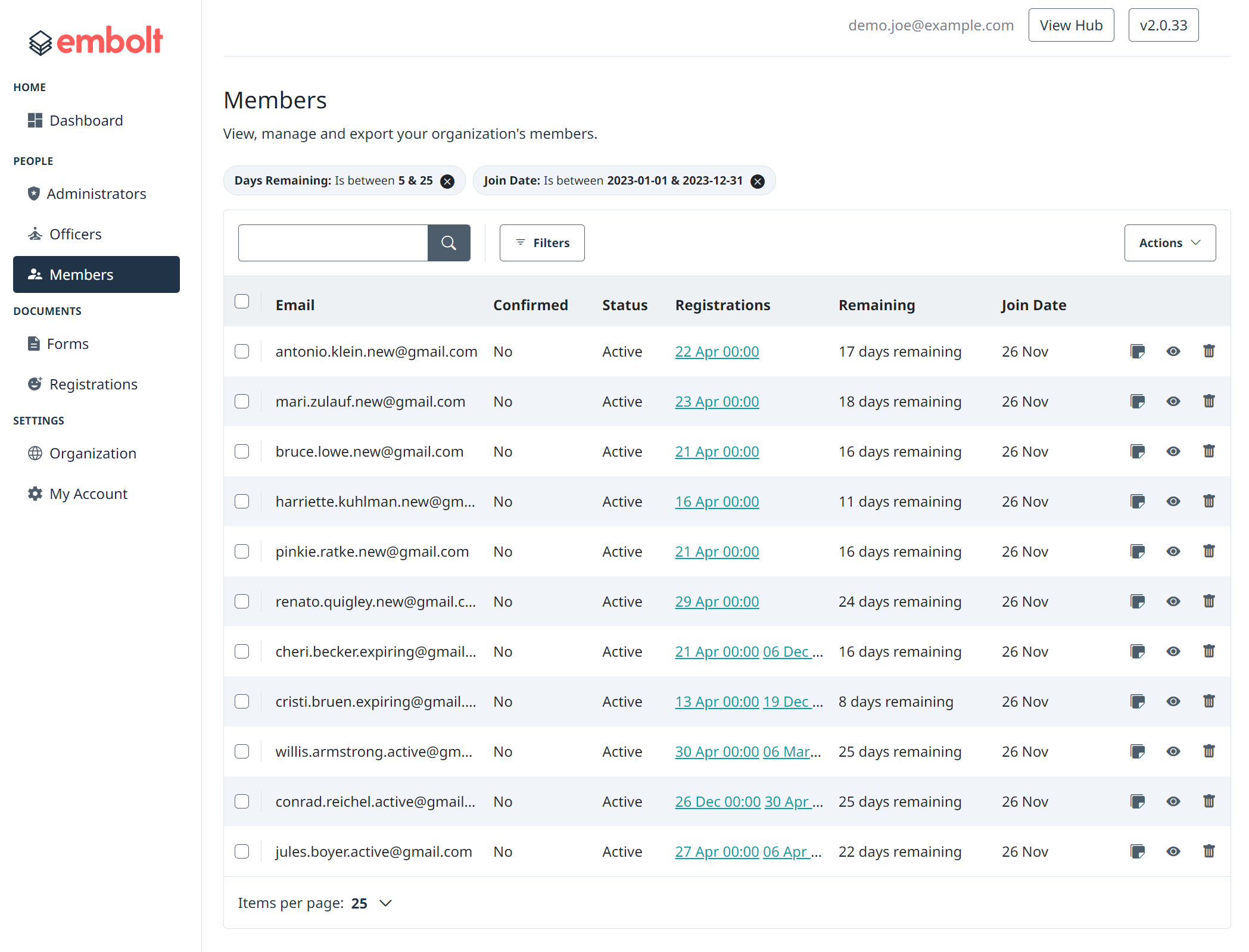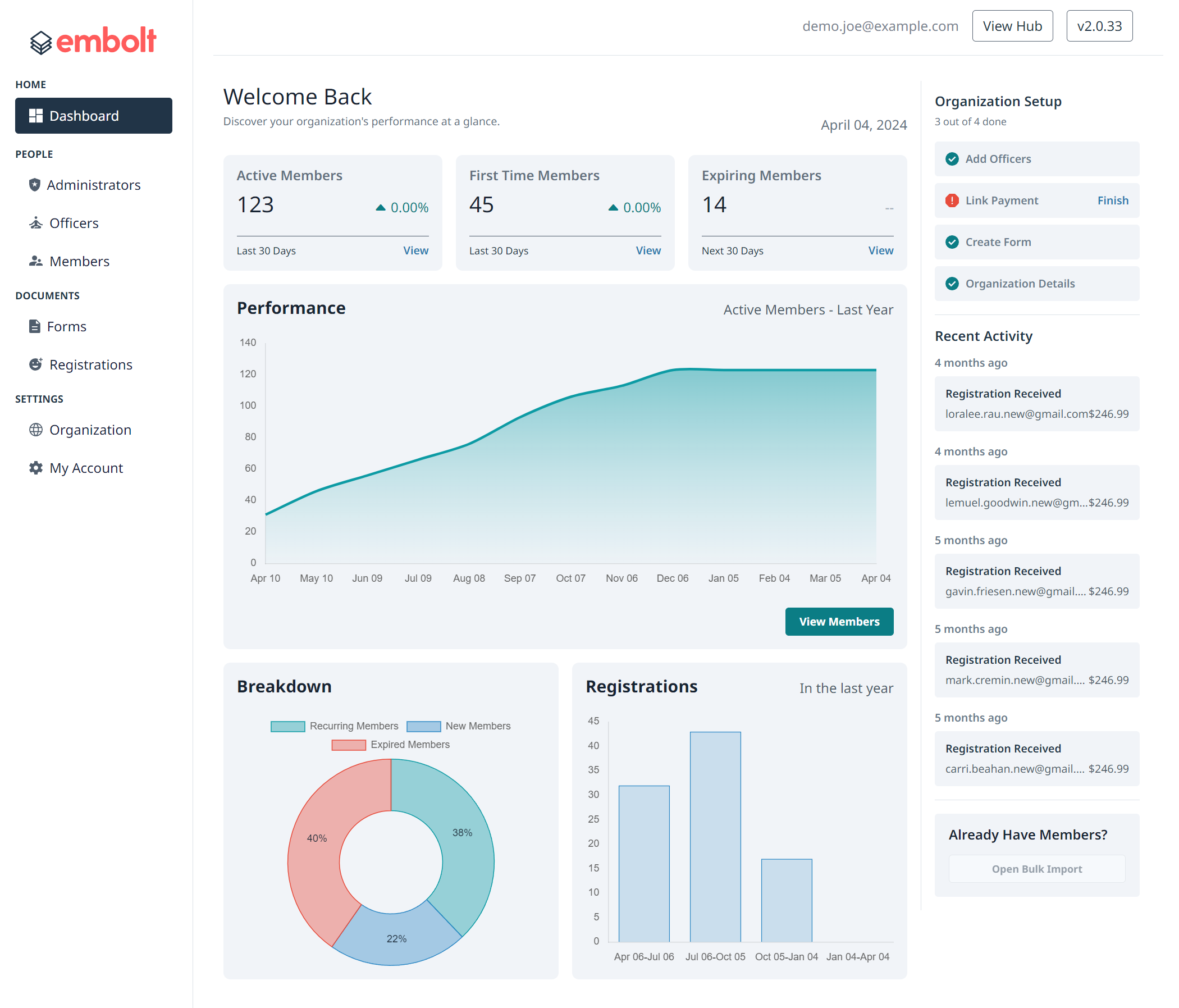 Build a customize-able registration hub for your members and use embolt’s admin panel to manage everything from members to mailing lists.