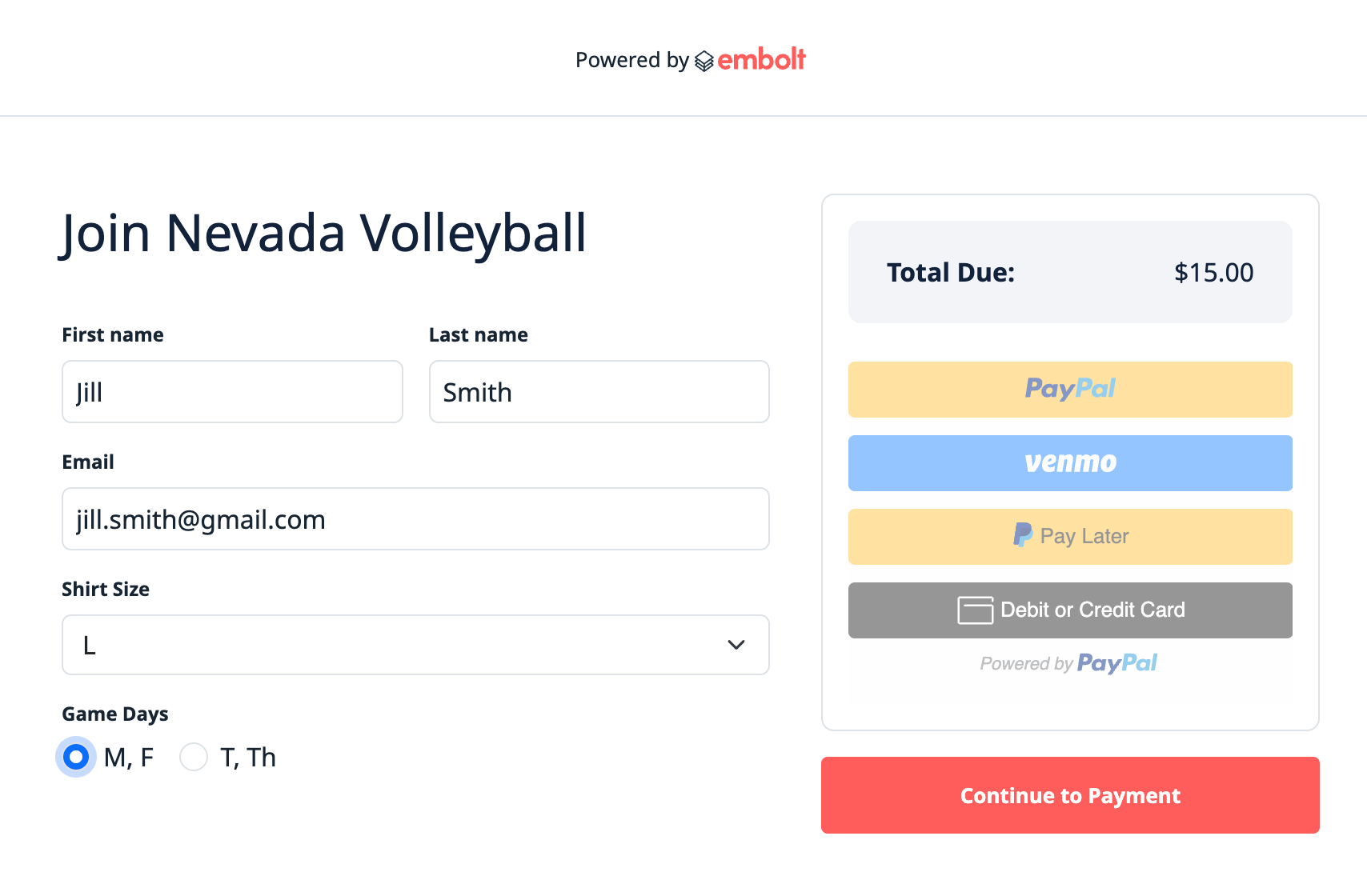 As an example, the UNLV Mountain Club uses embolt.app to manage and collect dues all online, allowing their members to register and pay with Credit Card, PayPal, or even Venmo.
