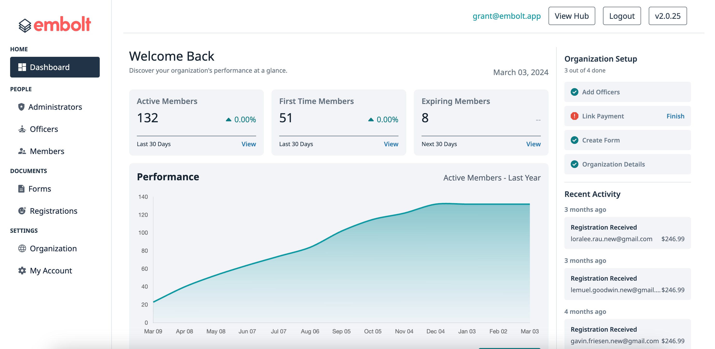For clubs looking to ditch the spreadsheets, or start charging dues, you can signup and get started with embolt in as little as five minutes: