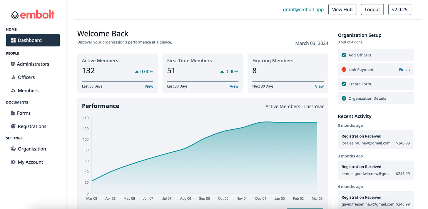 embolt allows you to create a registration form that fits your clubs needs, set a price, define how long the registration will last (e.g. a year), then share out your own custom hub for members to register:
